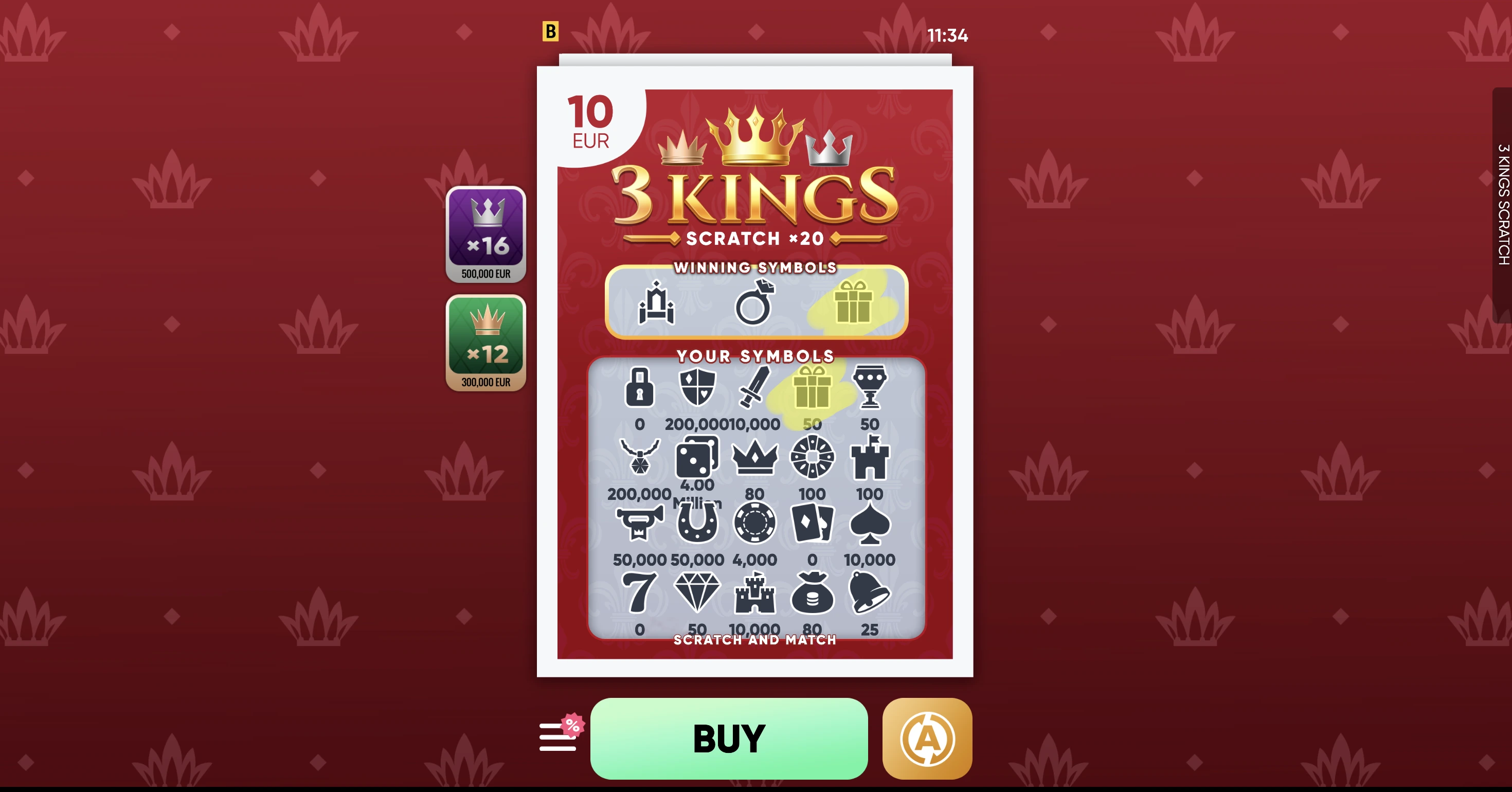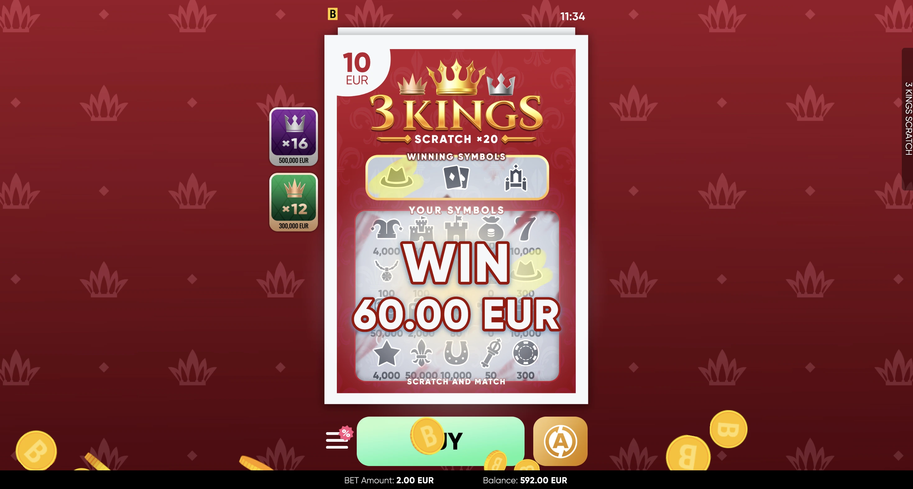 3 Kings Scratch offers players the chance to win substantial prizes, with the biggest win available being up to 20,000 times your bet. This massive payout potential makes 3 Kings Scratch a highly rewarding game for players looking for big wins.