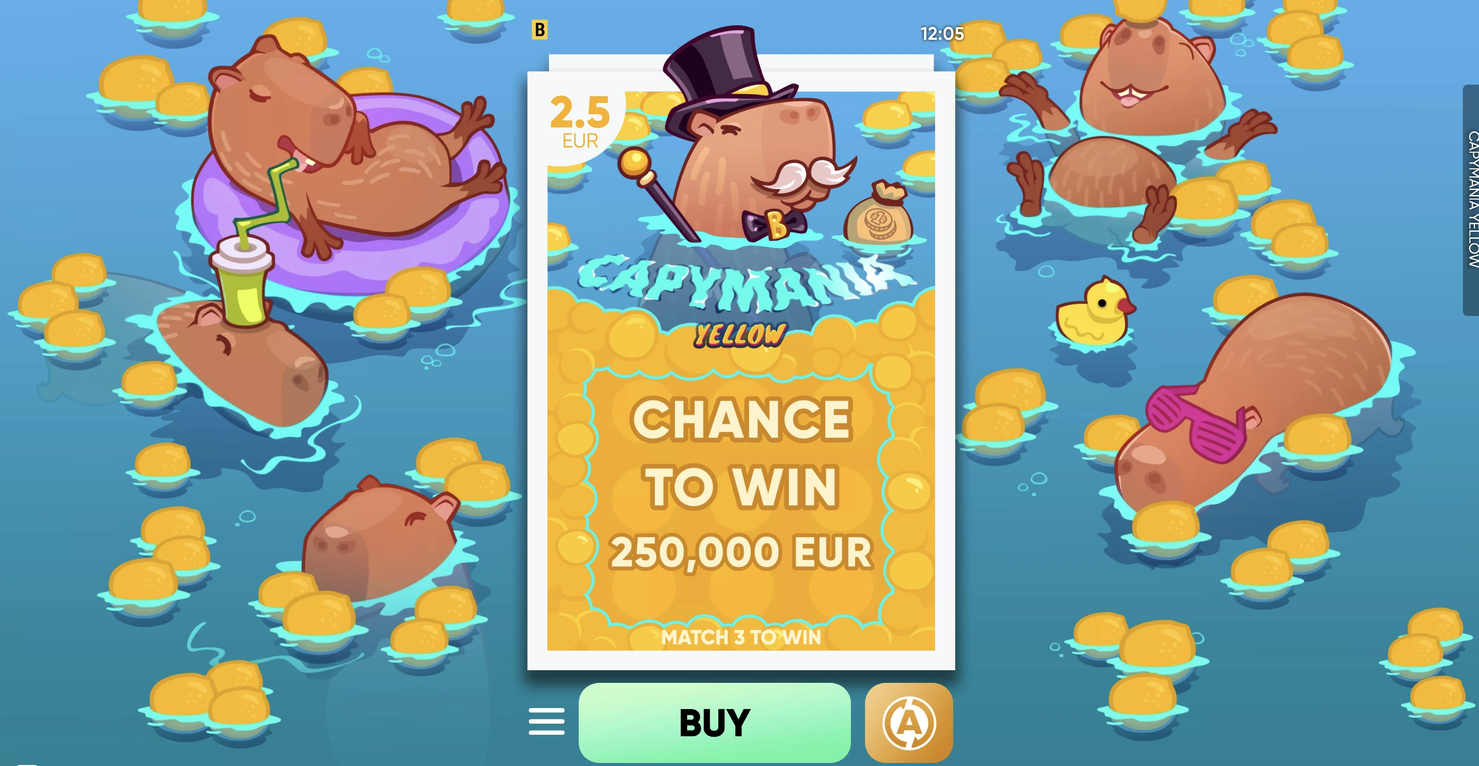 Capymania comprises a set of casual titles in yellow, green, and orange skins, each featuring different betting values. In these instant-win games, players scratch off nine cells on the playing card to reveal hidden values and aim to match three to win.