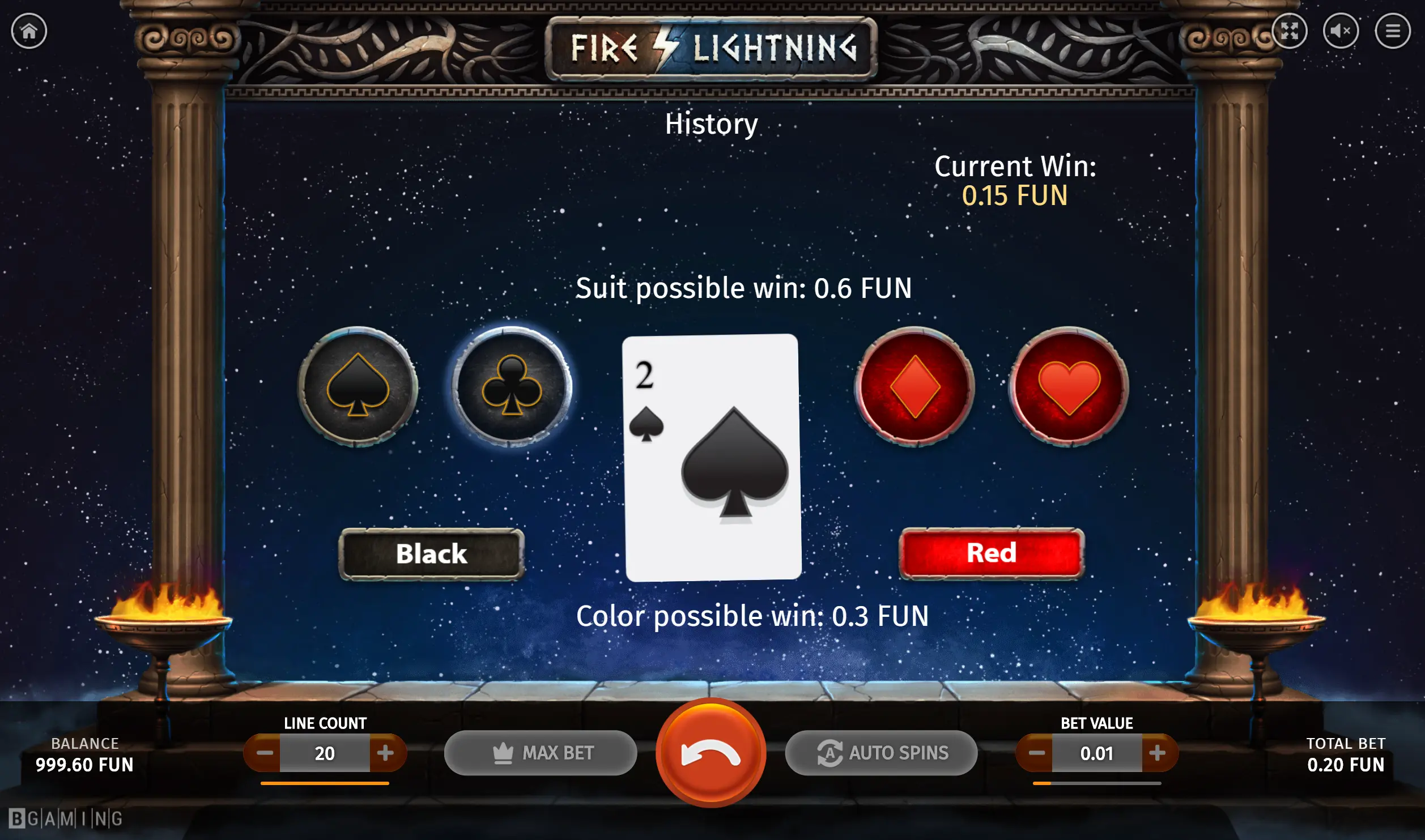 The Gamble round becomes available after any winning in the main game. Players should guess the color or the suit to increase the winning.