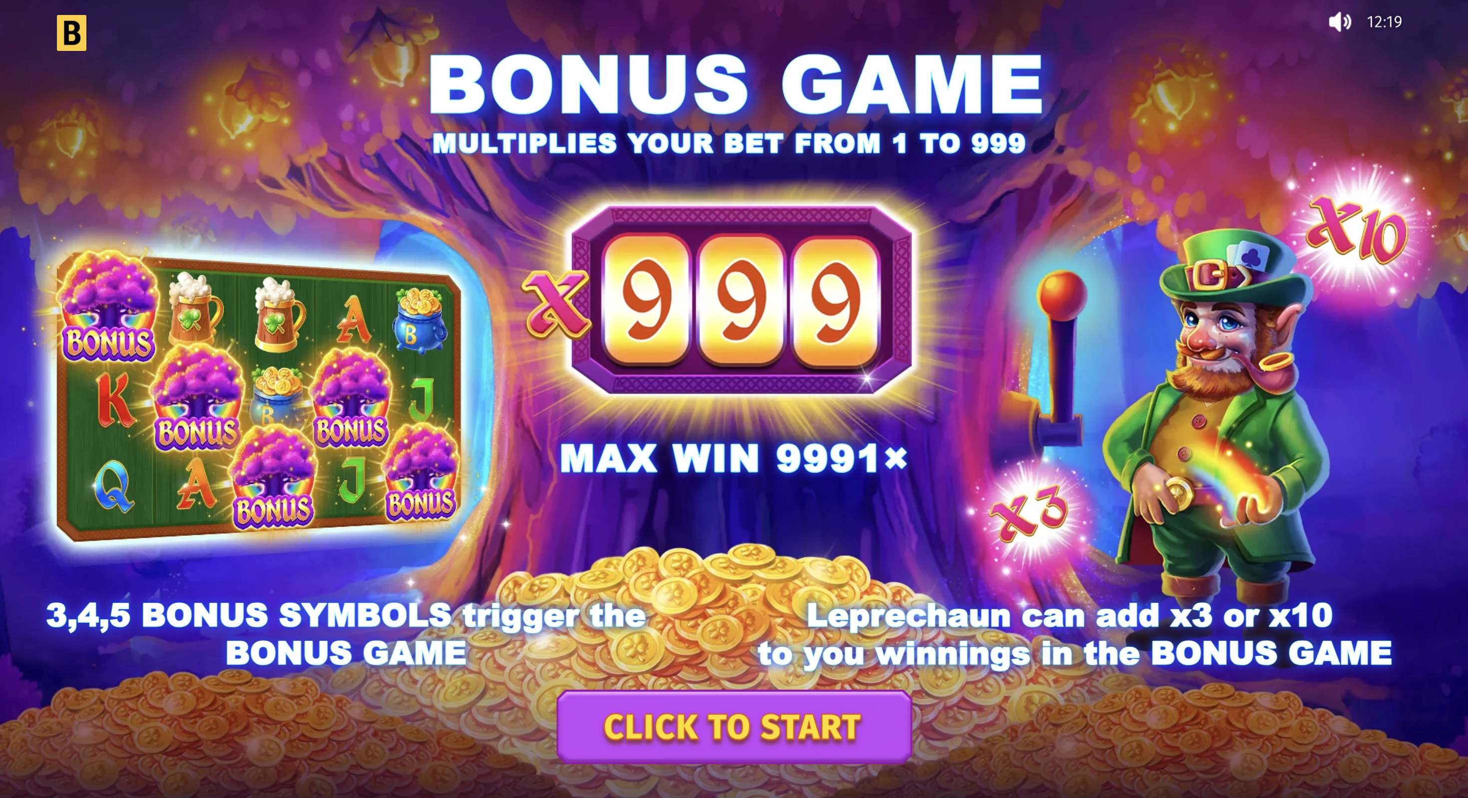 A leprechaun makes a slot machine spin. Once it stops, the machine shows three figures determining the multiplier applied to the player's bet.