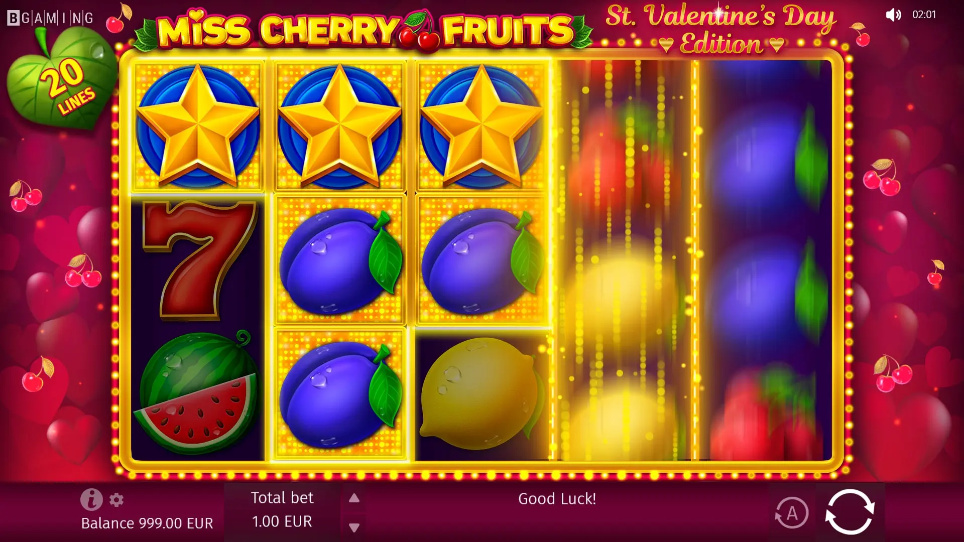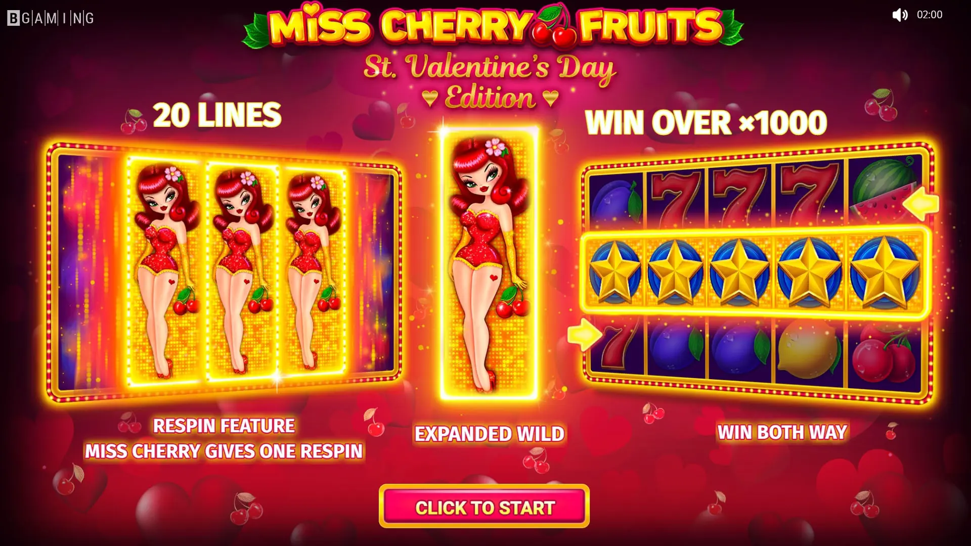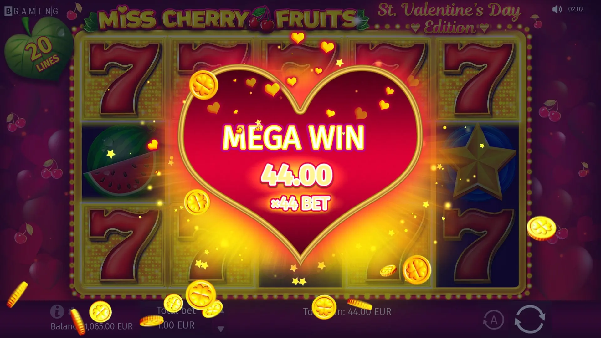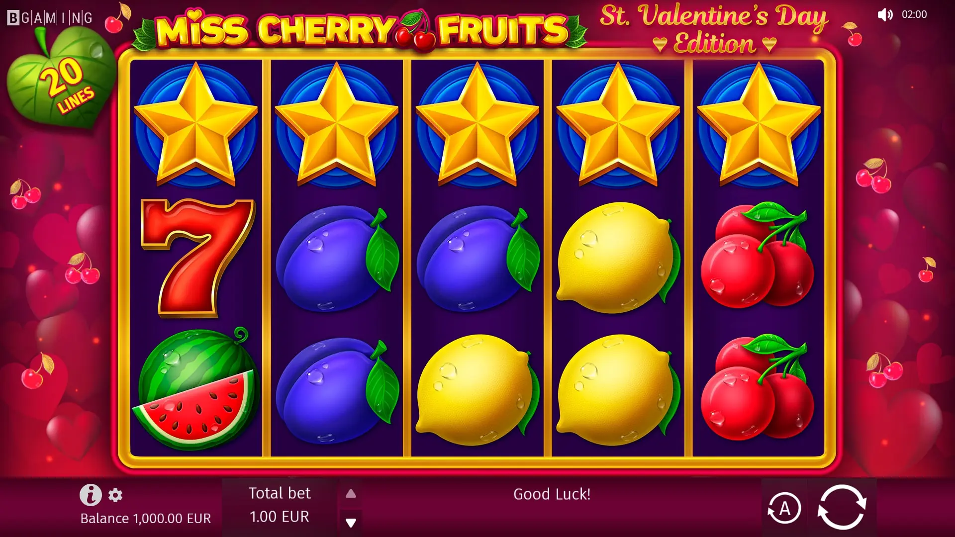 Celebrate the day of love with Miss Cherry Fruits St. Valentine's reskin! This generous slot offers terrific prizes and boasts a 96.13% RTP. Try your luck, multiply your bet up to x1000, and let Miss Cherry Fruits make your Valentine's Day magical!