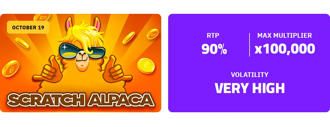 This gaming set comprises 3 exciting titles: Gold Alpaca, Silver Alpaca, and Bronze Alpaca. They differ in visual skins and playing bet values to cater to players of all preferences, but one thing is common – an x100,000 max win. The rules lie in scratching off nine cells on the playing card to reveal hidden values. If 3 numbers match, the instant win is applied to the balance. It's as simple as that!
