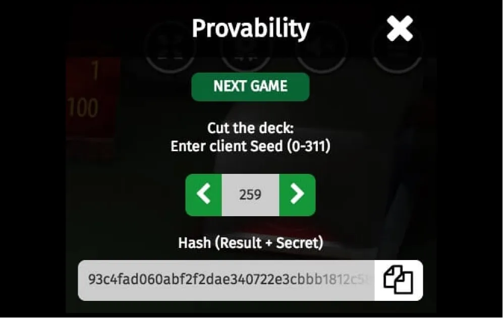 This is Next game block of the Provably Fair widget – Hash (Result + Secret).