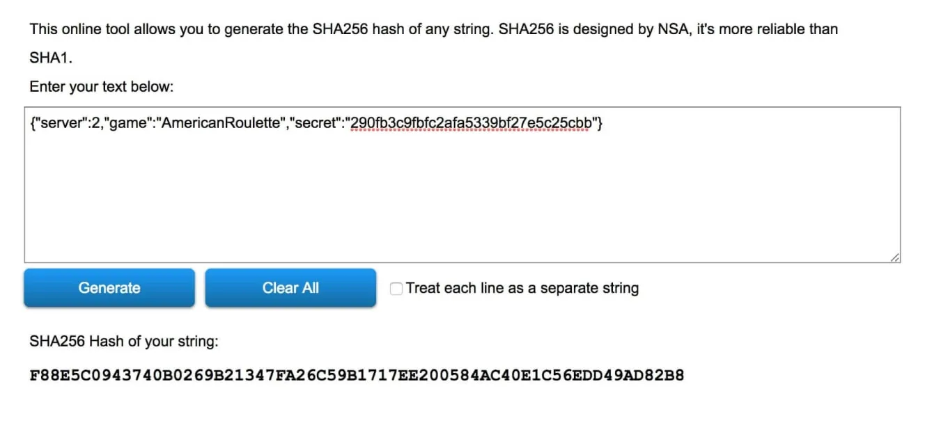Now let’s compare the Hash our online tool generated to the one player received in the game – Hash (result + secret) f51a2650ccac3416 b0dbc9ac10a7f5de 0334a2b5d