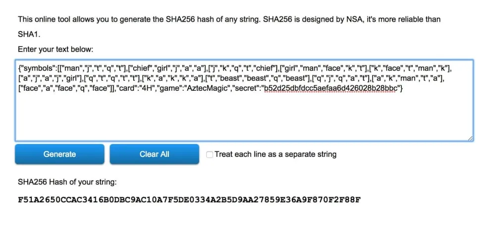 Take the Result + Secret. This looks like a string: {“symbols”: [[“man”,”j”,”t”,”q”,”t”],[“chief”,”girl”, ”j”,”a”,”a”],[“j”,”k”,”q”,”t”,”chief”],[“girl”,”man”,”face”,”k”,”t”],[“k”,”face”,”t”, ”man”,”k”],[“a”,”j”,”a”,”j”,”girl”],[“q”,”t”,”q”,”t”,”t”], [“k”,”a”,”k”,”k”,”a”],[“t”,”beast”,”beast”,”q”,”beast”], [“q”,”j”,”q”,”a”,”t”],[“a”,”k”,”man”,”t”,”a”],[“face”,”a”,”face”,”q”,”face”]], ”card”:”4H”,”game”: